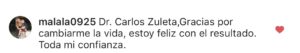 Esta será la última valoración presencial, luego de la realización del procedimiento. En este punto, el Dr. Carlos zuleta Bechara, dará el aval para el regreso a su ciudad/país de destino.